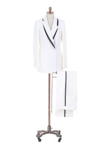 Crisp white tailoring with bold black contrast — a striking suit designed for elegance, versatility, and modern power dressing.