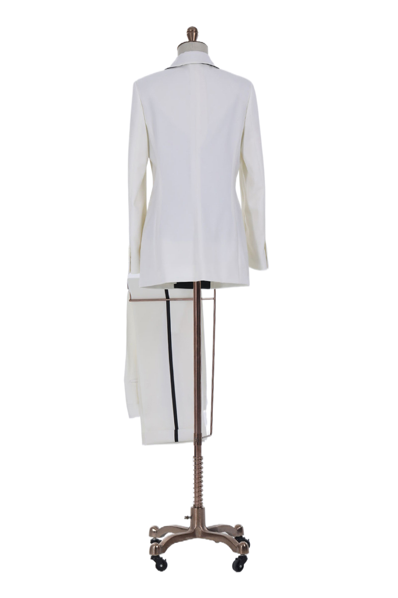 A statement in modern minimalism, the Ivory Noir Contrast Suit blends crisp tailoring with striking detail. Crafted in pristine white, the jacket’s sleek shawl collar is edged with a bold black trim, mirrored by matching accents on the trousers. Designed with a tailored silhouette, this suit captures both elegance and power — perfect for boardrooms, black-tie events, or high-fashion evenings.