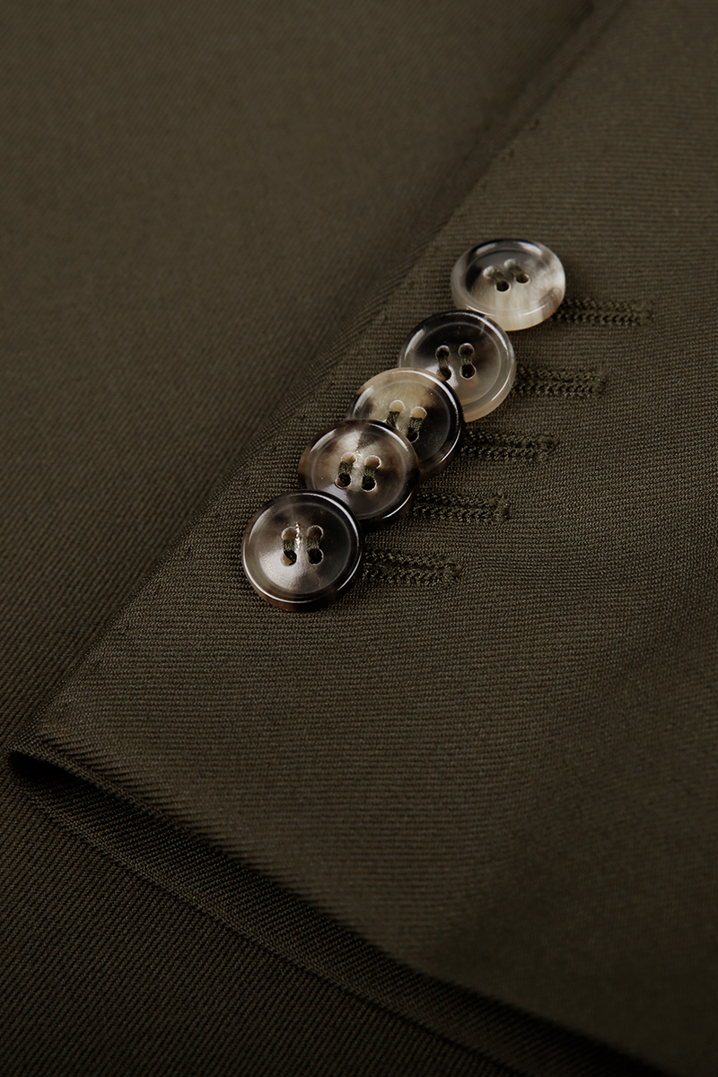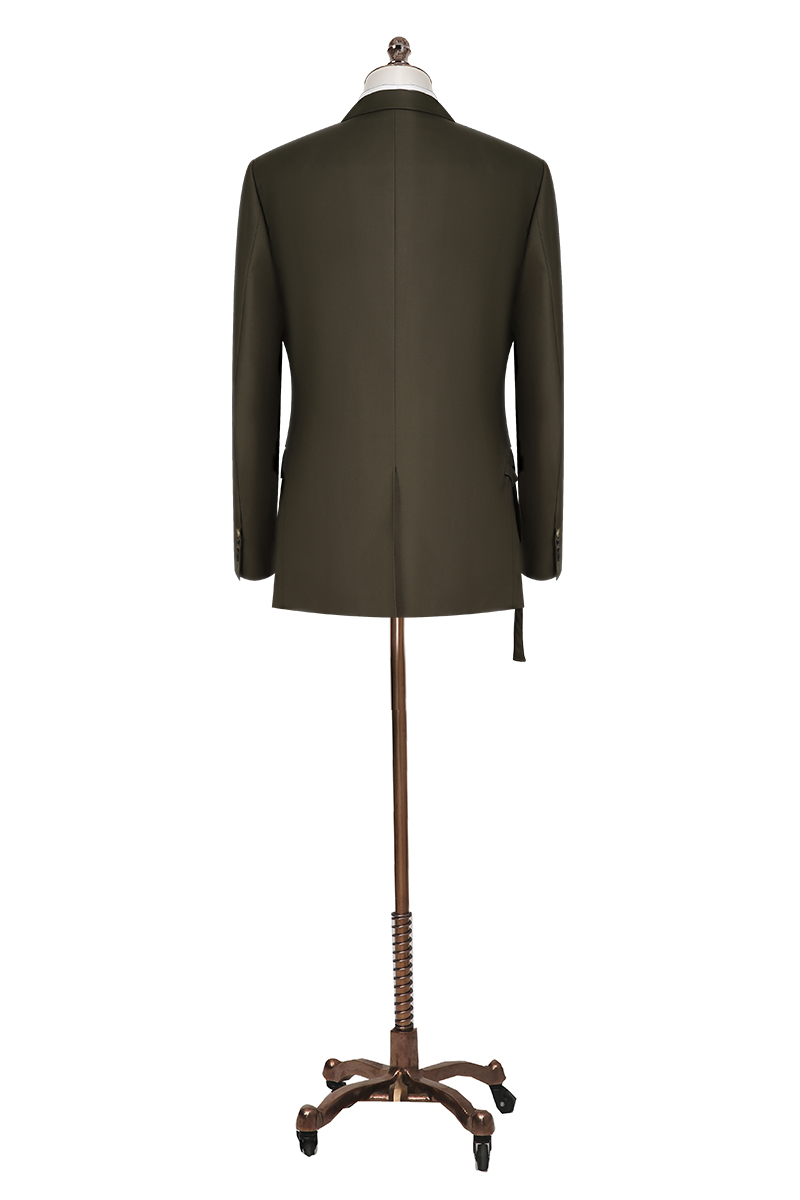 A deep-olive wrap-front suit with peak lapels and side-tab trousers—modern, refined, and unmistakably GFV.