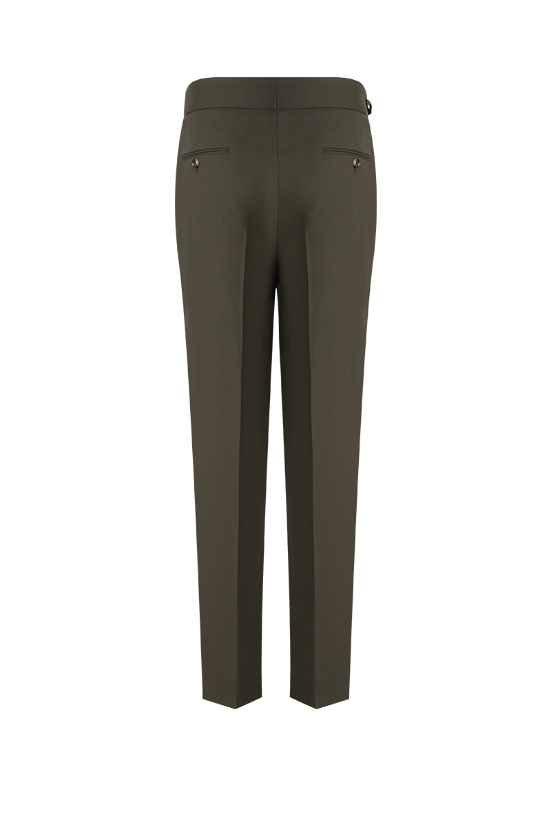 The matching trousers continue the tailored precision with a single front pleat, crisp crease, and side-tab adjusters—a belt-free finish that keeps the waist impeccably clean. Crafted from a smooth, lightweight wool-blend twill, the suit drapes beautifully and wears comfortably from daytime meetings to evening engagements.