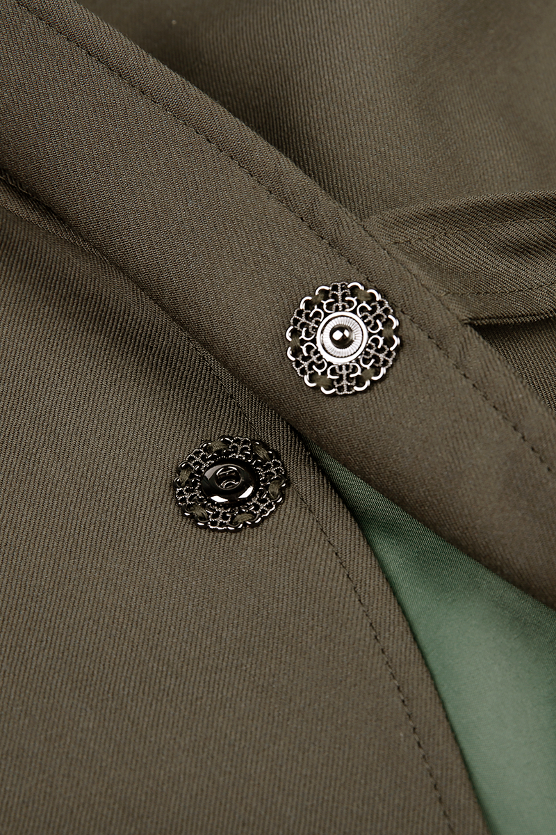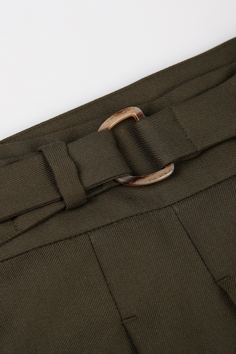Cut in a deep olive tone, the Olive Regent Wrap-Front Suit delivers statement tailoring with quiet confidence. The jacket features a distinctive wrap closure that fastens neatly at the side with a refined buckle tab and an interior clasp for a clean, sculpted line. Broad peak lapels and lightly structured shoulders balance modern sharpness with classic proportion, while patch-flap pockets keep the silhouette sleek.