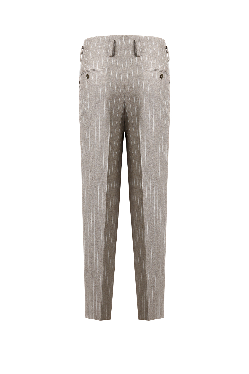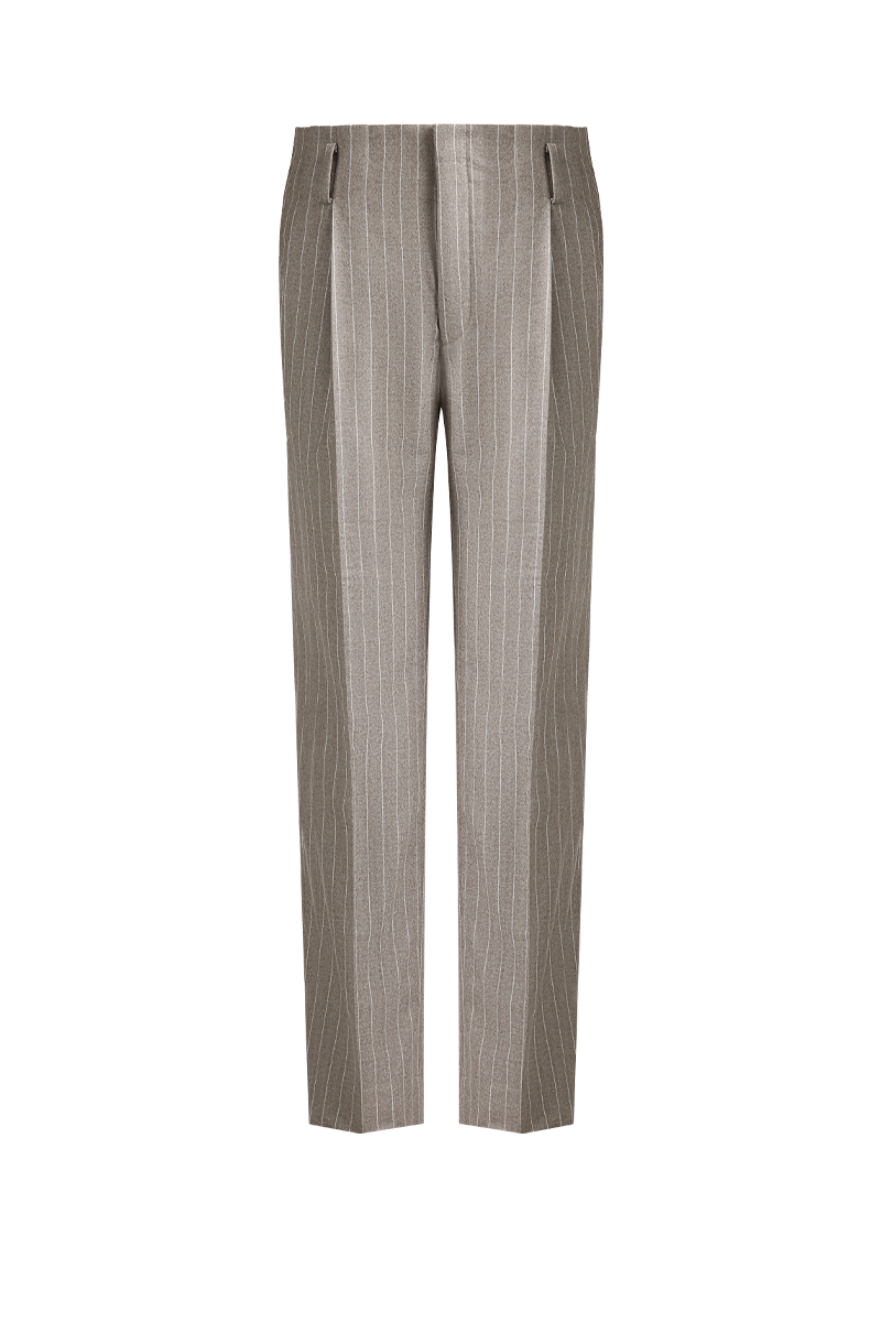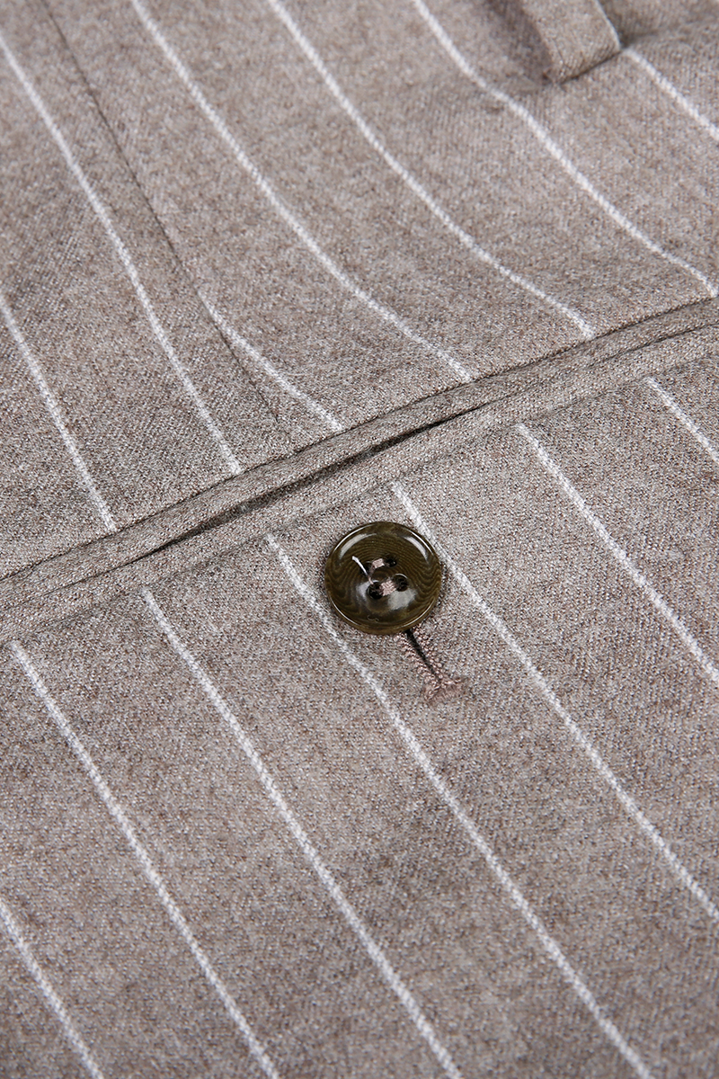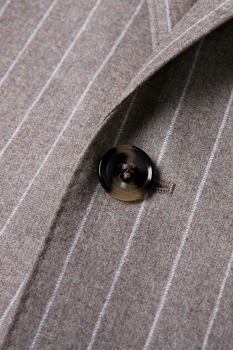 A taupe-grey single-breasted suit with white pinstripes, designed for modern versatility and timeless refinement.