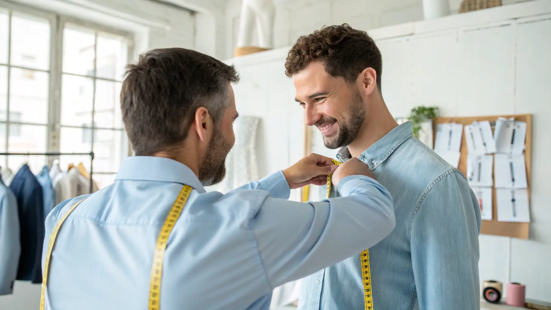 A close-up shot of a tailor's hands meticulously measuring the shoulder width of a client, using a flexible measuring tape. The focus is on the precision and attention to detail.